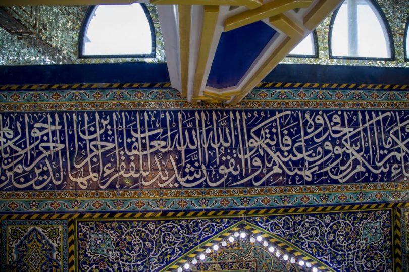 وعدَد الخطوط التي يتم الكتابة بها والتي تتضمن “خط الثلث والنسخ والرقعة” وغيرها من الخطوط، ومن بين الأضرحة المزينة ببلاط السيراميك ضريح العباس عليه السلام.