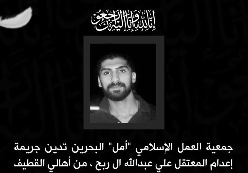 نعت جمعية العمل الإسلامي “أمل”، في البحرين، الشهيد السعيد علي عبدالله عبدالكريم آل ربح ، الذي أقدمت سلطات النظام السعودي على إعدامه ظلمًا وعدوانًا، رغم عدم إدراج اسمه ضمن قوائم الإعدام المعلنة، في مخالفة واضحة لأبسط معايير العدالة، وفي جريمة جديدة ترتكب بحق أبناء القطيف الصامدين.