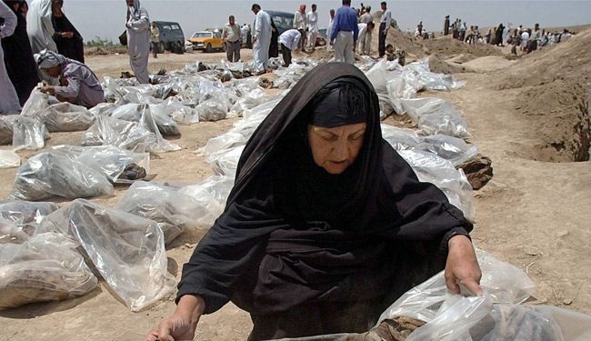 ولفت الى أن “المقابر الجماعية التي بلغت المئات وغطت ارض العراق شاهد حي على إجرام النظام الصدامي واستهتاره بالقيم السماوية وحقوق الإنسان”.