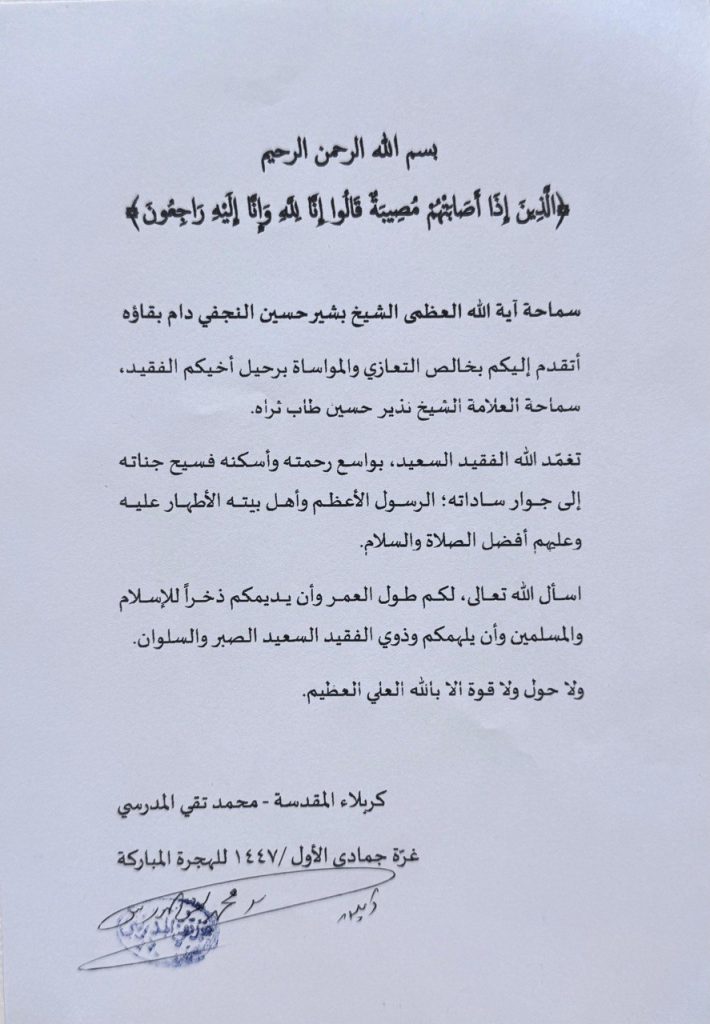 بعث سماحة المرجع الديني آية الله العظمى السيد محمد تقي المدرسي (دام ظله) برقية تعزية خطية إلى سماحة المرجع الديني آية الله العظمى الشيخ بشير النجفي (دام ظله)، معزياً إياه بوفاة شقيقه المرحوم العلامة الشيخ نذير النجفي (طيب الله ثراه).